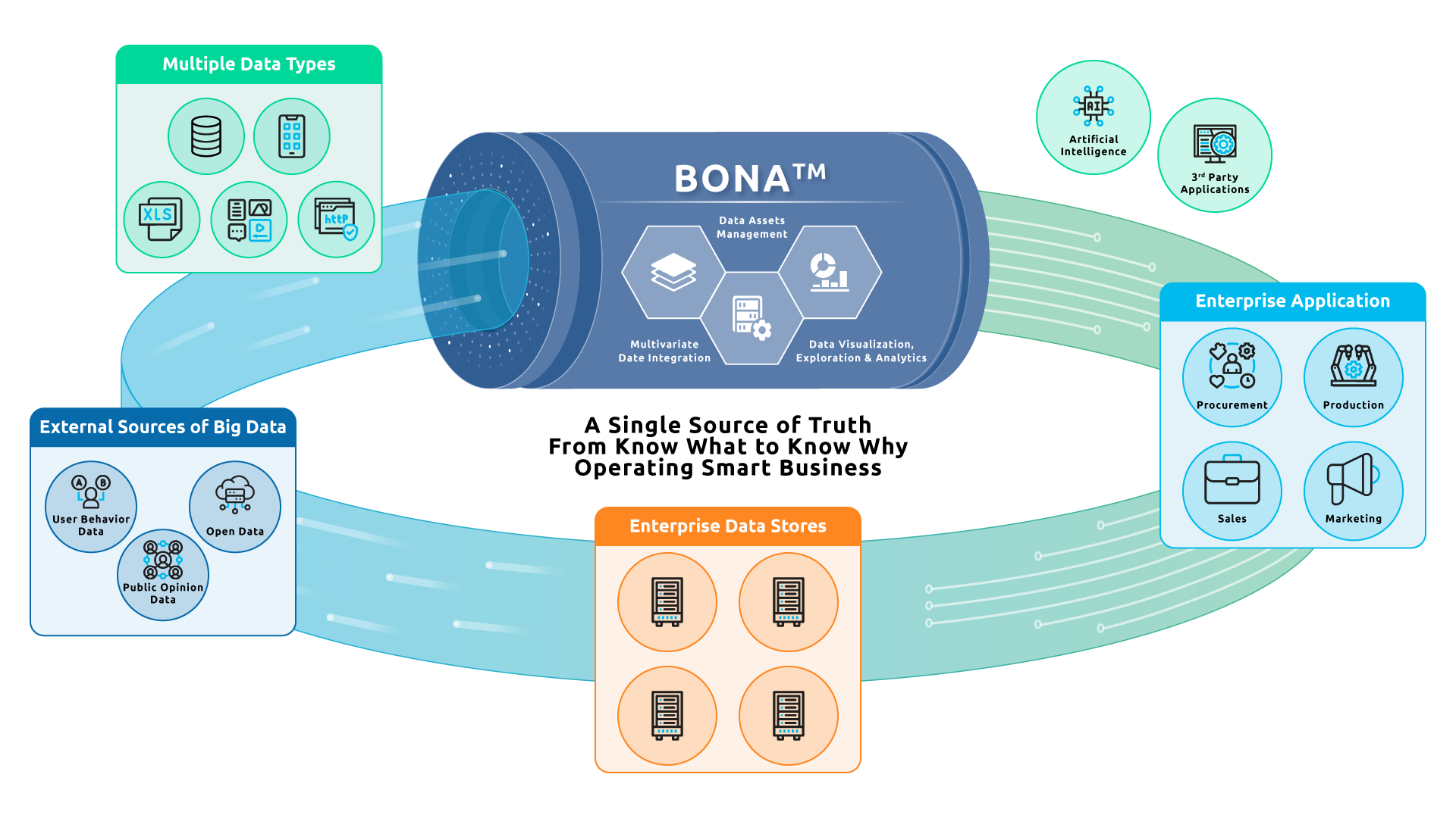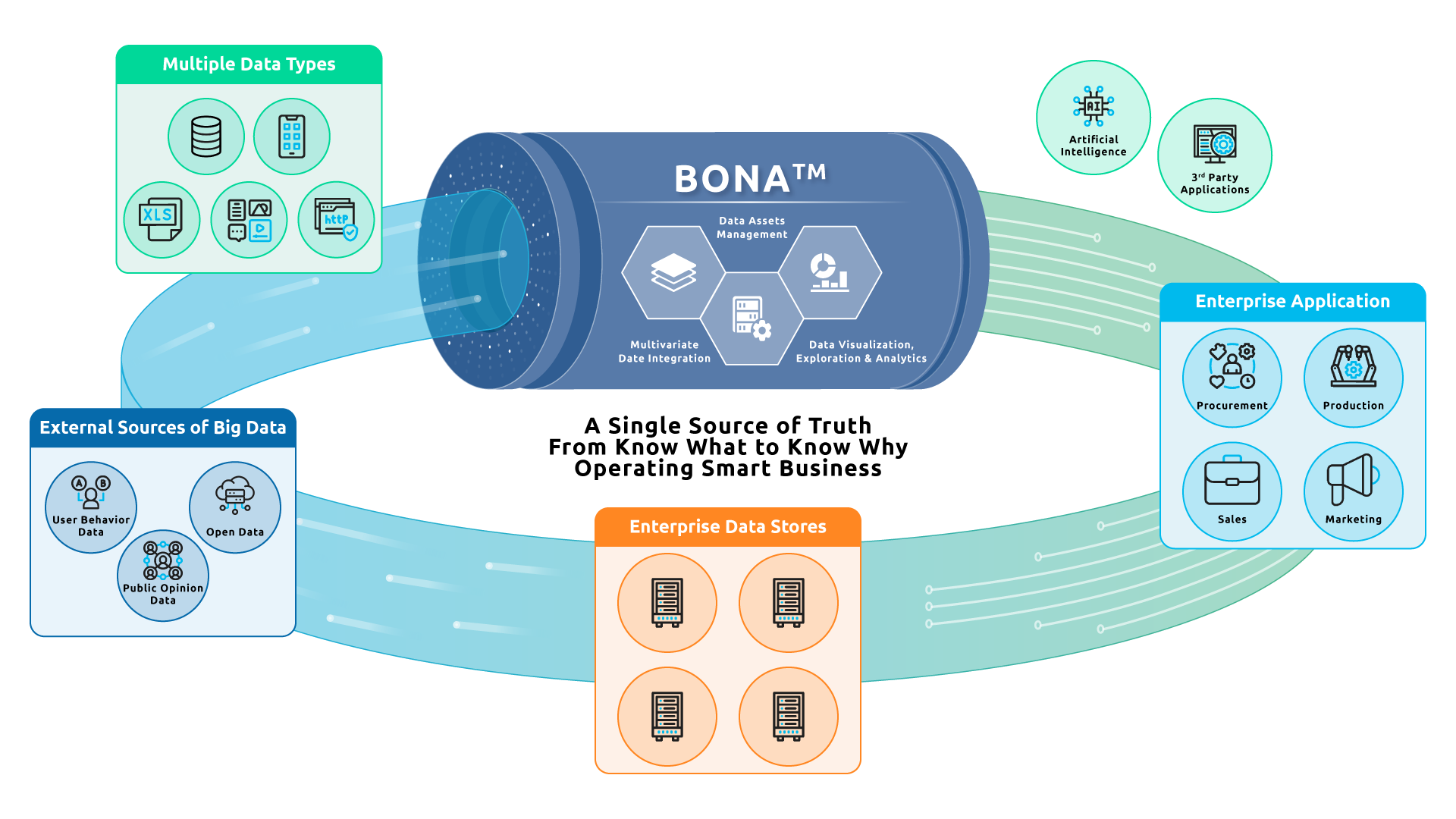 BONA™, our live data management and exploration platform, breaks data silos and processes continuous data at high speed, making corporate-wide data assets readily available.